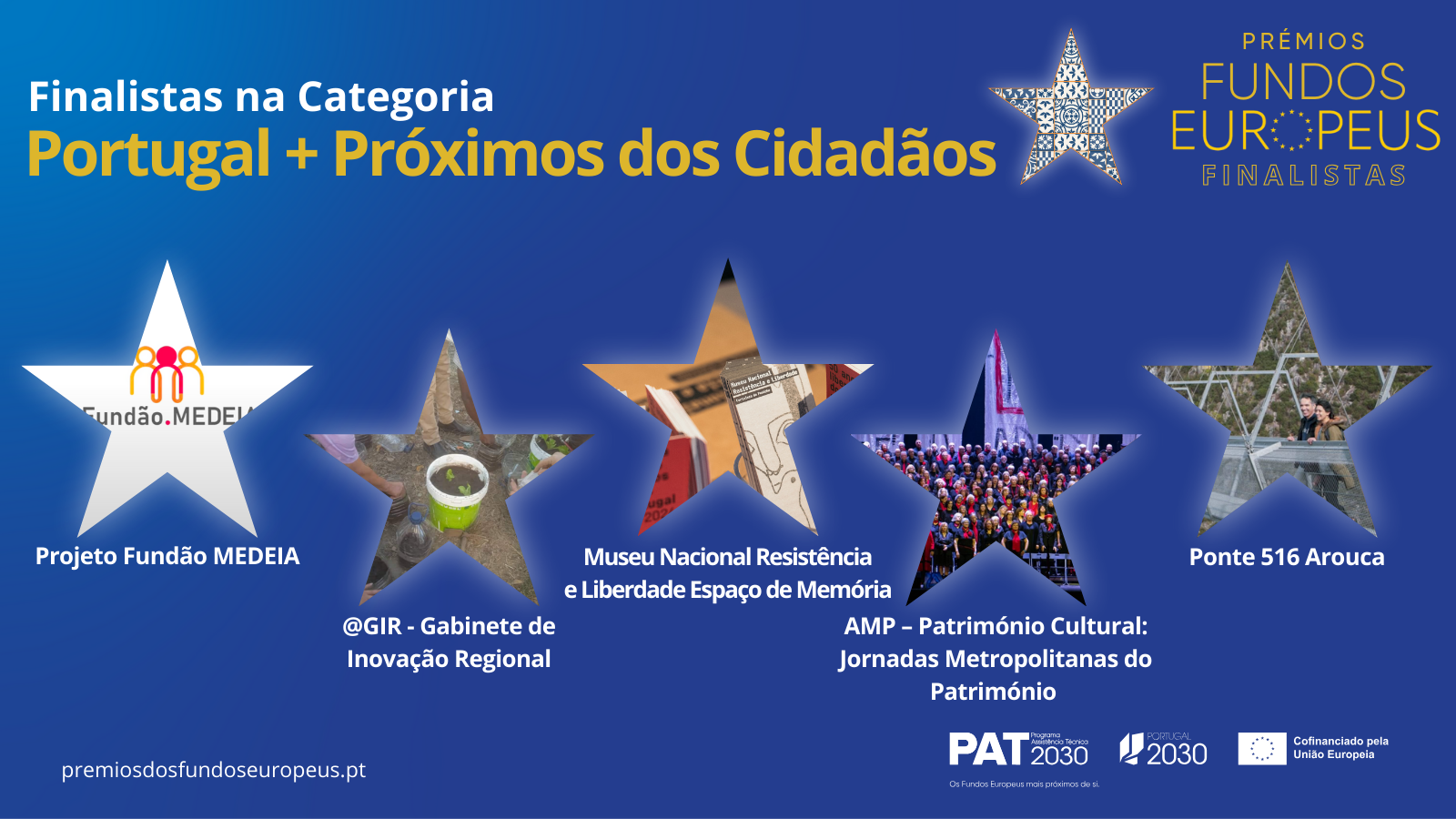 “Prémios dos Fundos Europeus” é a competição que visa a promoção de projetos financiados pela União Europeia, através do Portugal 20201, do Programa Operacional de Apoio às Pessoas Mais Carenciadas (POAPMC), do Portugal 2030 e do Programa do Fundo para o Asilo, a Migração e a Integração (FAMI 2030), com o objetivo de demonstrar o impacto de projetos apoiados por fundos europeus no desenvolvimento social, económico e ambiental nos territórios onde são implementados, evidenciando a importância do apoio europeu.